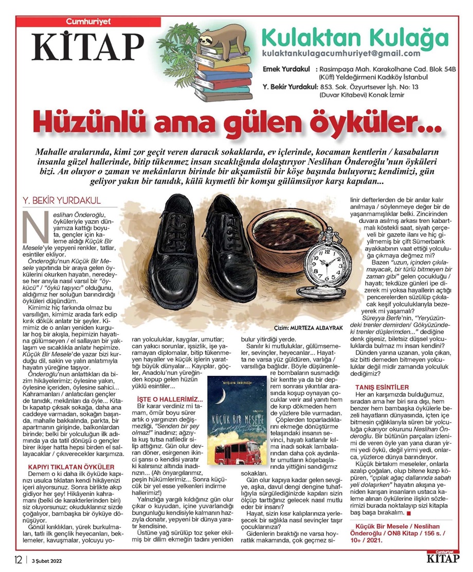 Basından Haberler Hüzünlü Ama Gülen Öyküler... Y. Bekir Yurdakul, Cumhuriyet Kitap, 3 Şubat 2022 Paylaş Tweet et