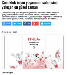 Basından Haberler Çocukluk insan yaşamının sahnesine yakışan en güzel zaman Umut Dağlar, İleri Haber, 24 Ekim 2021 Haberi okumak için görsele tıklayınız. Paylaş Tweet et