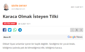 Basından Haberler Karaca Olmak İsteyen Tilki Sevin Okyay, BirGün, 28 Aralık 2021 Haberin tamamını okumak için görselin üzerine tıklayınız. Paylaş Tweet et
