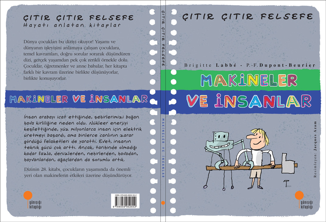 Çocukları erken yaşta felsefeyle tanıştıran ve tüm dünyada her yaştan okurun beğenisini kazanan “Çıtır Çıtır Felsefe” dizisinin yaratıcısı Brigitte Labbé, Türkçeleşen 28. kitabında insan-doğa-teknoloji arasındaki etkileşimi tartışmaya açıyor. Makinelerin insan yaşamındaki etkisini yargıya varmadan, örnekler ve sorular eşliğinde irdeleyen kitap, çift yönlü bir bakış açısı sunuyor. Bir yandan makinelerin yaşamımızdaki önemini ve insanı özgürleştirdiğini açıklarken, diğer yandan onu nasıl tutsak kılabildiğini, üstelik doğayı da tahrip edebileceğini hatırlatıyor. Minik filozofları çoklu düşünmeye davet eden renkli kitap,Jacques Azam’ın karikatür tadındaki desenleriyle boyutlanıyor.Her yaştan okuru, sorular sormayı ve düşünmeyi gündelik yaşamın bir pratiği haline getirmeye özendiren, eğitimcilerin ve ebeveynlerin ilk okuma önerileri arasındaki dizi, yeni kitaplarıyla zenginleşiyor.