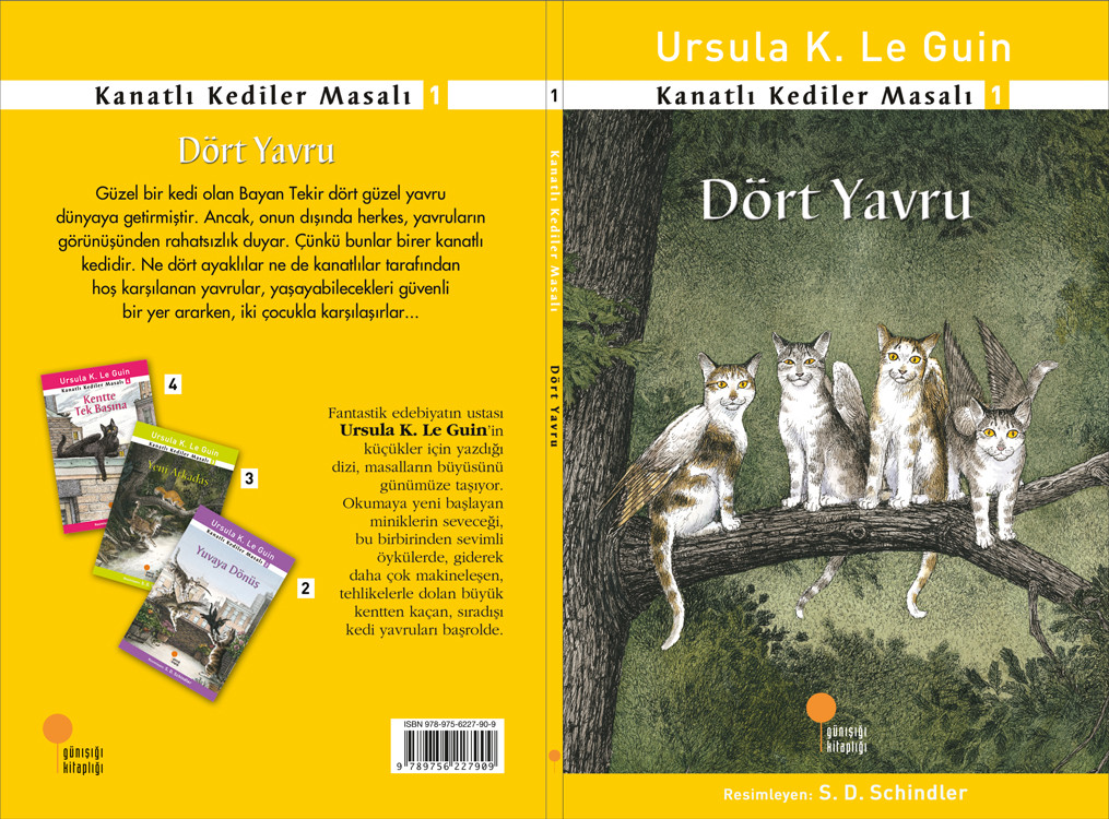 Fantastik edebiyatın dünyada en çok okunan ustalarından Ursula K. Le Guin, “Kanatlı Kediler Masalı” dizisinin ilk kitabında küçük okurlarına dört sıradışı kedi yavrusunun, her geçen gün daha çok makineleşip, tehlikelerle dolan büyük kentten kaçış öyküsünü anlatıyor. S. D. Schindler’in özgün desenleriyle canlanan 4 kitaplık dizide, Le Guin kedilerin ilginç dünyasını onların en doğal halleriyle anlatırken, günümüzün sosyal konularını doğaüstü bir kurguyla işliyor ve masalla gerçeği yine başarıyla harmanlıyor.